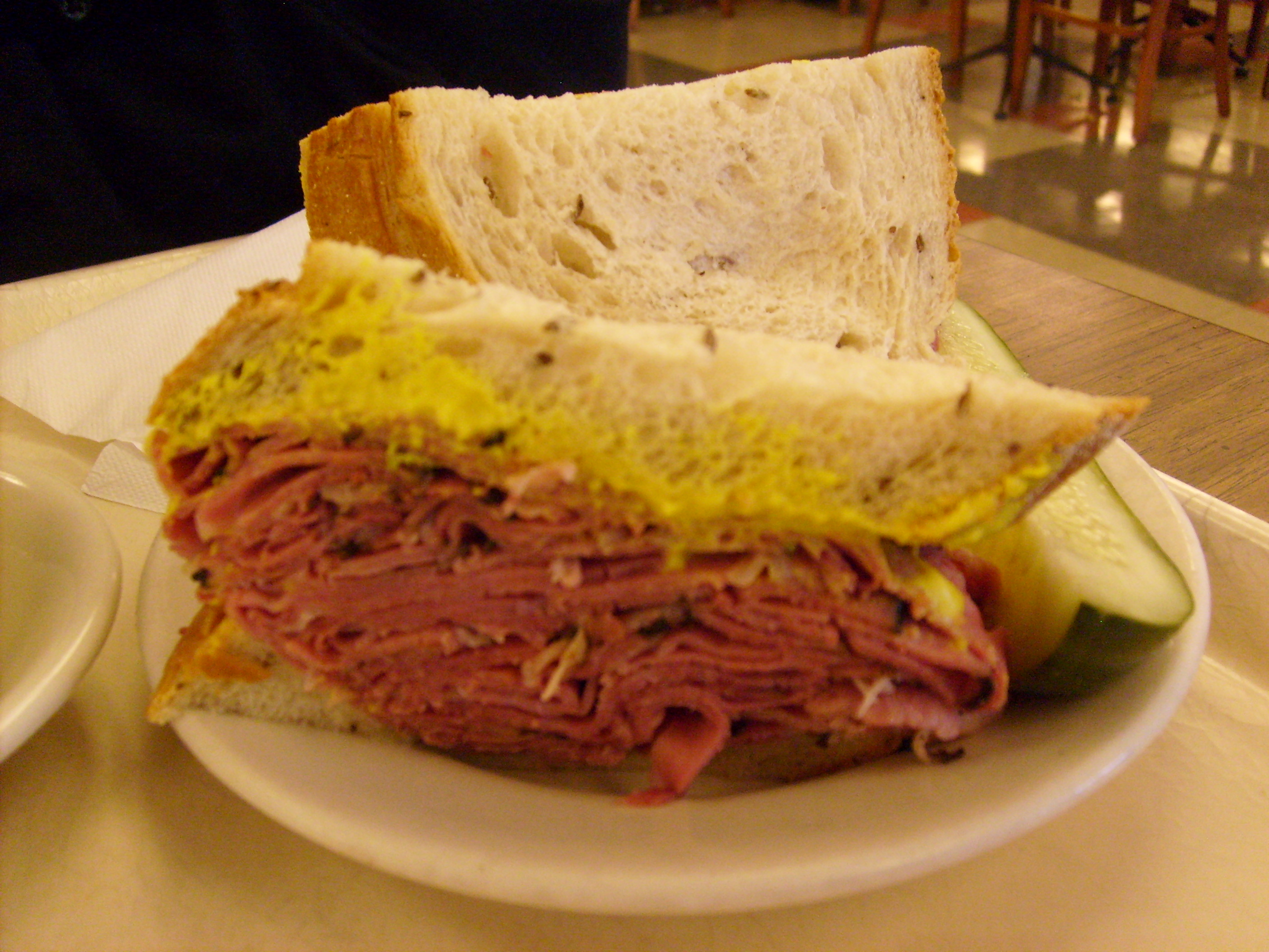 Bigger than it looks here and much better than it tastes when I lick the screen…warm, juicy pastrami. Order it with yellow mustard and Swiss on Shapiro’s own chewy rye. Dan says this is better than the pastrami sandwich he loved as a kid in New Joysey.