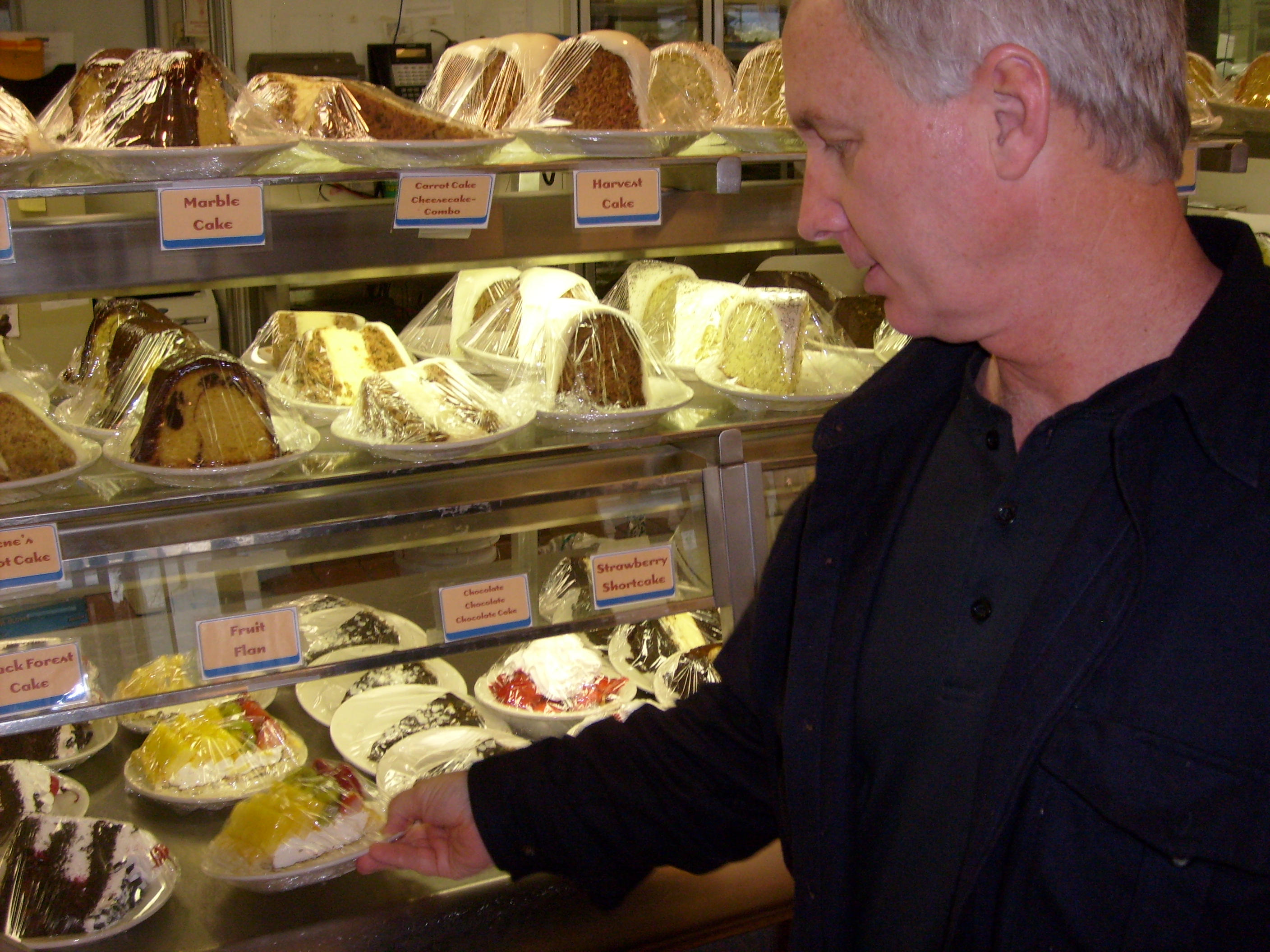 Still-sturdy tables from the ’70s(?) and wooden chairs worn at the back from being pulled out and pushed in add to the simple charm of this cafeteria/deli/bakery.