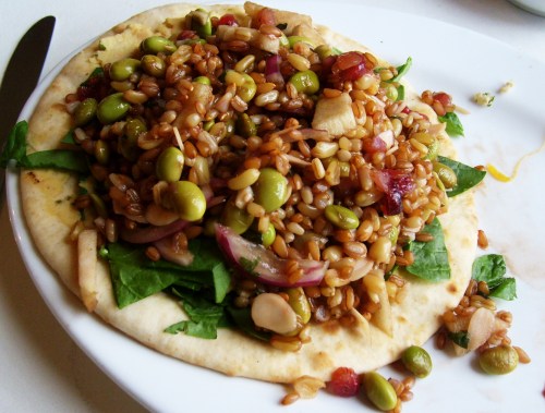 The café’s vegetarian/vegan generous menu helped when I was on my Daniel Fast during our first visit. I ordered the King of Siam sandwich—a pita topped with (deep breath): hummus, cranberries, apples, almonds, spinach leaves, fava beans, red onion, and grain pilaf.