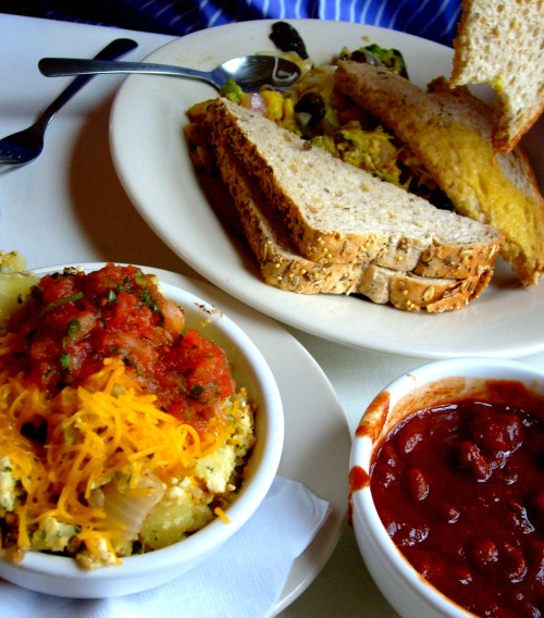 My husband enjoyed the omelet with goat cheese (I’m thinking there may be a long-lost fourth sister in here), onions, and mushrooms with a side of vegan chili.