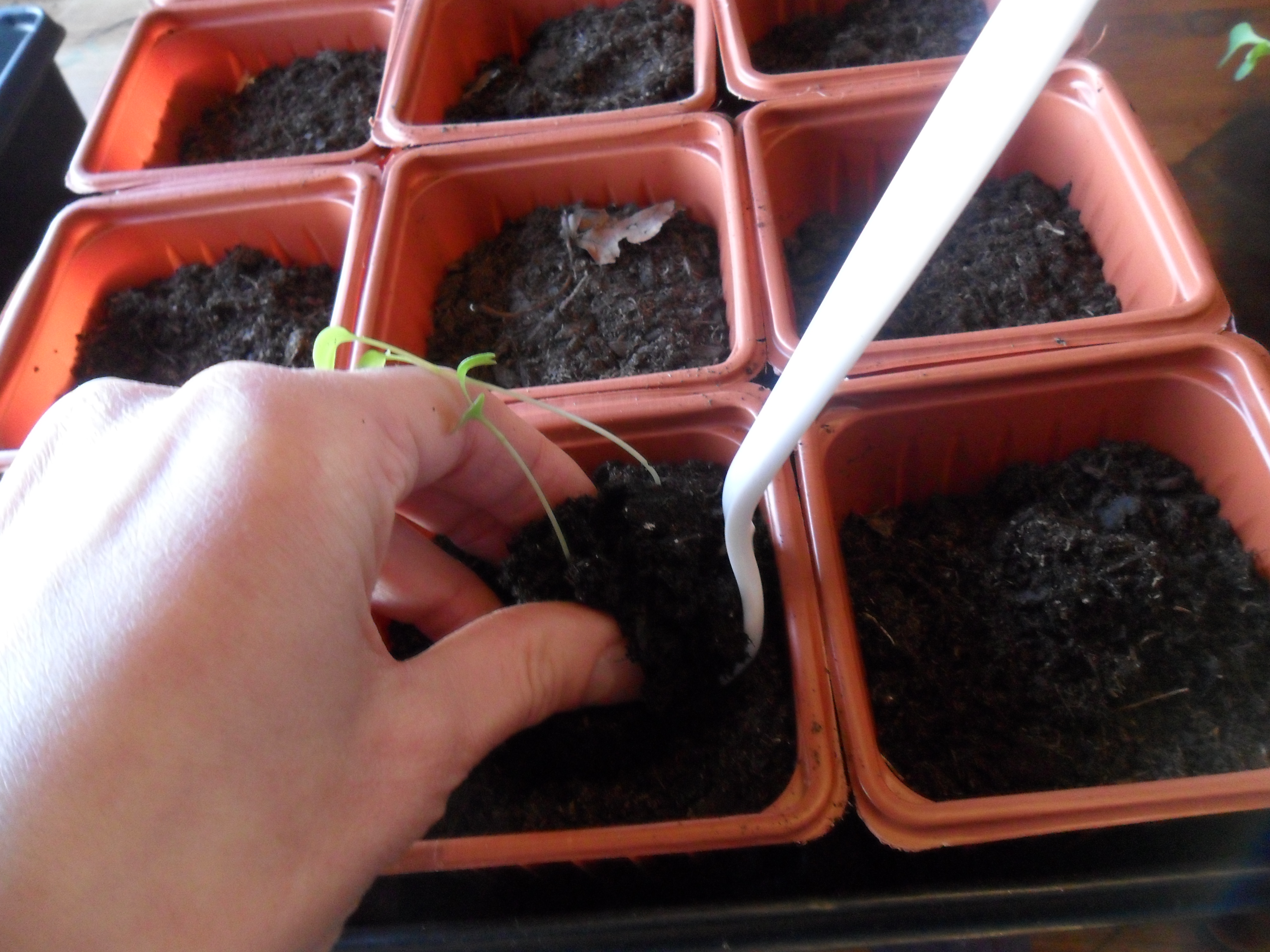 I gently loosened and scooped them out, transplanting them into larger containers (where I would have started them had I known how quickly they’d grow). The roots were already long, but it was the thready stems I had to be careful not to snap.