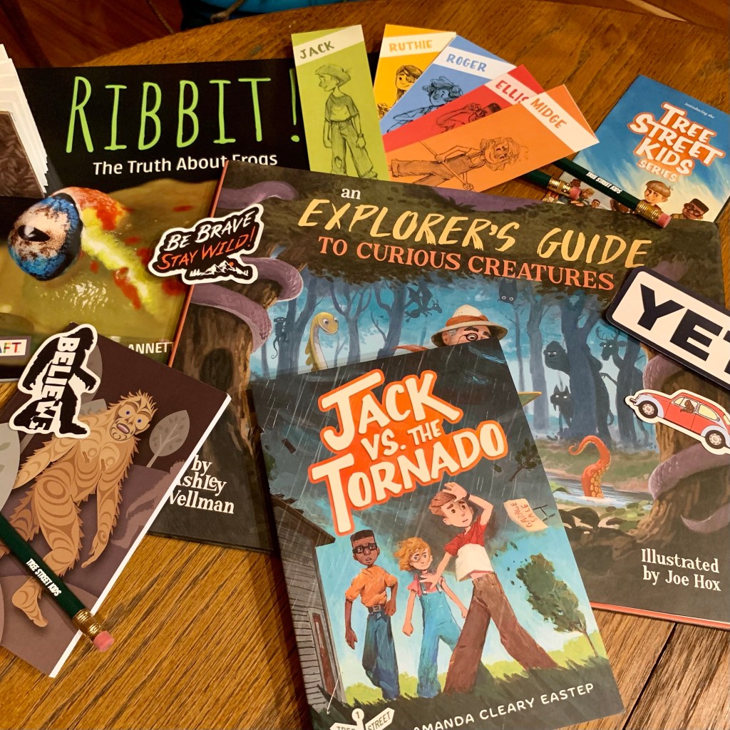 One winner of the random drawing will receive signed copies of Jack vs. the Tornado (book 1 in the series), Ribbit! by Annette Whipple, The Explorer’s Guide to Curious Creatures by Ashley Wellman and illustrated by the amazing Joe Hox, plus other fun items pictured here.